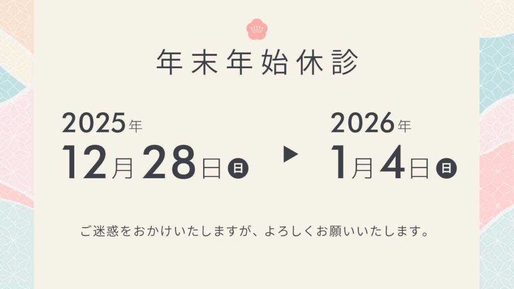 12月28日(日)~1月4日(日) 上記日程は休診とさせていただきます。 年始は1月5日(月)より通常通り診療いたします。 年末に近づくと外来の混雑が予想されます。 定期受診中の皆様におかれましては、計画的な受診をいただきますよう、ご理解とご協力の...