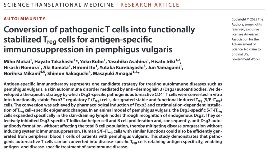 “Conversion of pathogenic T cells into functionally stabilized Treg cells for antigen-specific immunosuppression in pemphigus vulgaris”と題した論文において、機能的に安定化させた誘導型制御性T細胞(induced regulatory T cell; iTreg)が、尋常性天疱瘡モデルマウスにおいて抗原特異的に症状を抑制することが実証されました。また、尋常性天疱瘡患者の末梢血からも他の細胞の活性化を抑える抑制活性を持った安定化iTregを作製することに成功したと報告されました。